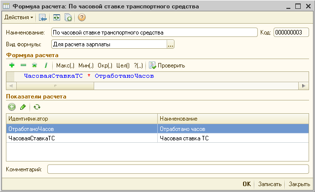 В примере выбрана формула «По часовой ставке транспортного средства». Эта формула добавляется при первом запуске конфигурации: