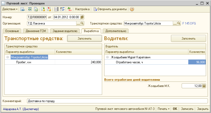 В путевом листе для транспортного средства «Микроавтобус Toyota Liticia» в табличной части «Водители» на закладке «Выработка» заполняем отработанное время у водителя - 96 часов, в реквизите «Всего отработано дней водителями» указываем количество отработанных дней — 12: