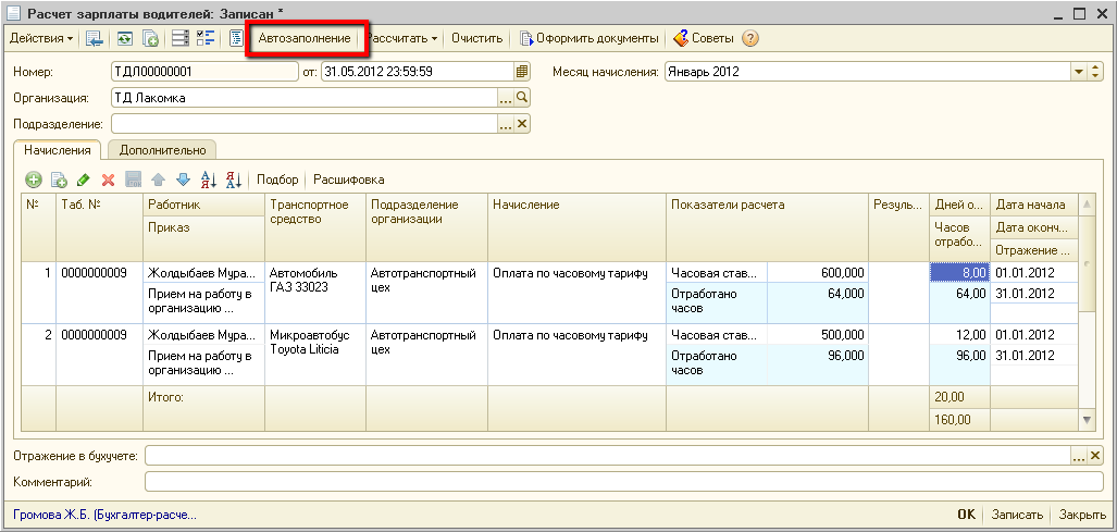 Выполним расчет начислений водителю в документе «Расчет зарплаты водителей». С помощью кнопки «Автозаполнение», заполним табличную часть «Начисления»: