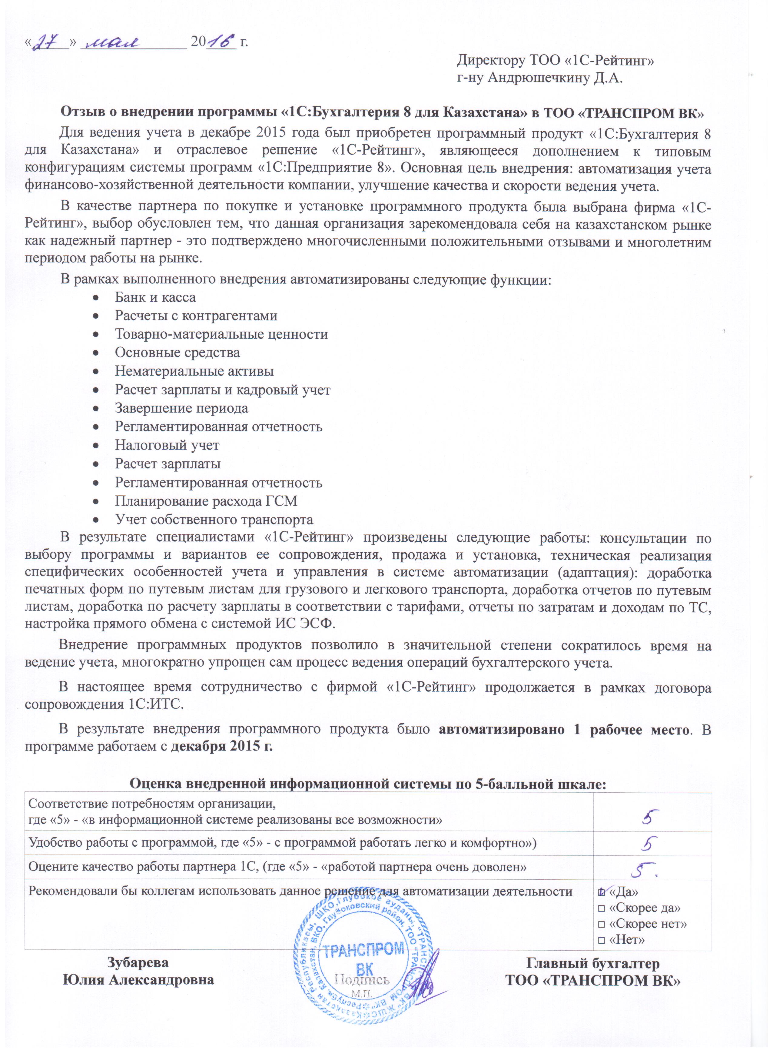 Программный продукт «1С-Рейтинг: Управление затратами на автотранспорт. Путевые листы» представляет собой дополнение к типовым конфигурациям системы программ «1С:Предприятие 8». Конфигурация разработана для платформы «1С:Предприятие 8». Внедрение данной доработки позволило автоматизировать процессы учета путевых листов, движения ГСМ, шин и аккумуляторов, в значительной степени сократилось время на ведение вышеуказанных операций, многократно упрощен сам процесс ведения данных операций.