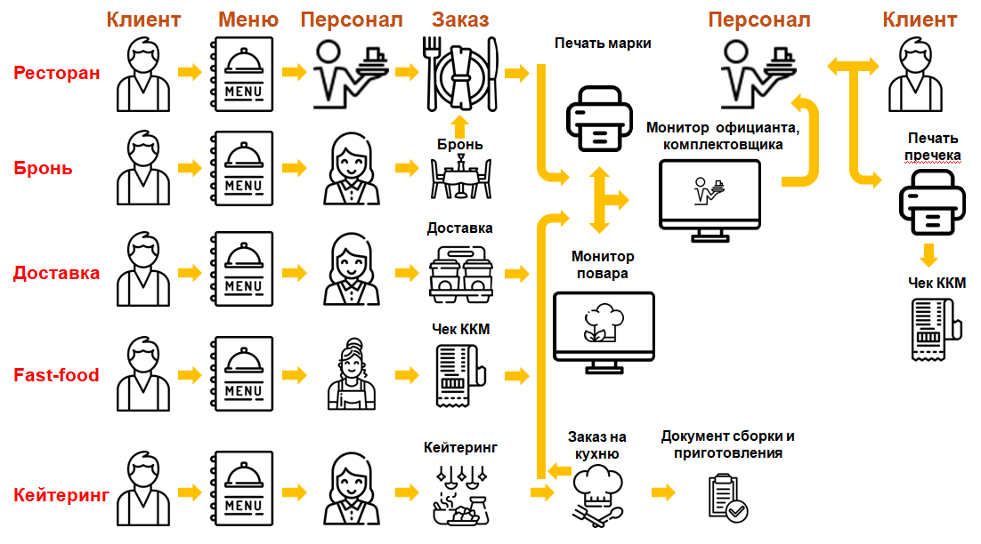 Программный продукт поддерживает схемы обслуживания: ресторан; бронь; доставка; fast-food; кейтеринг.